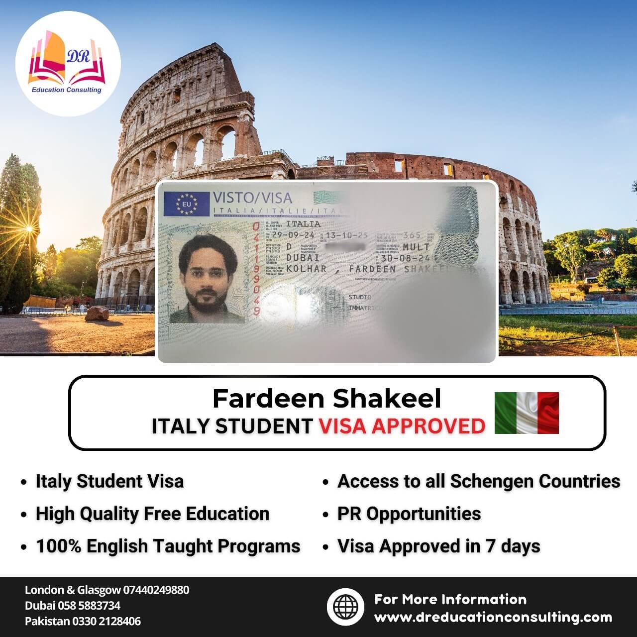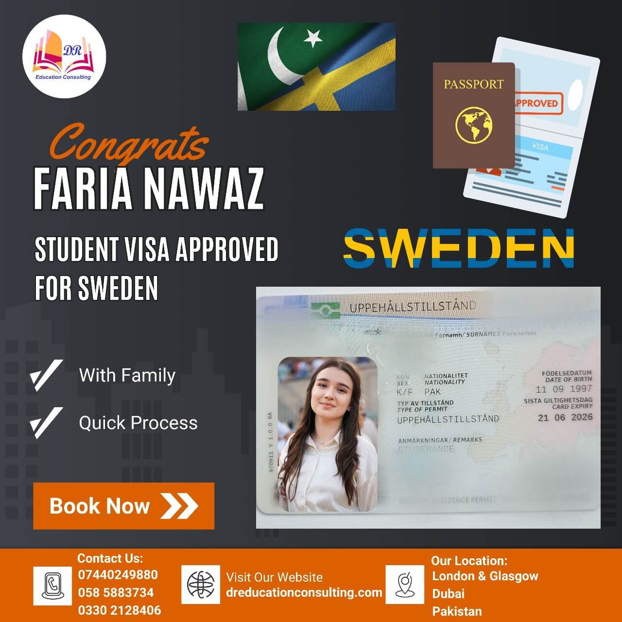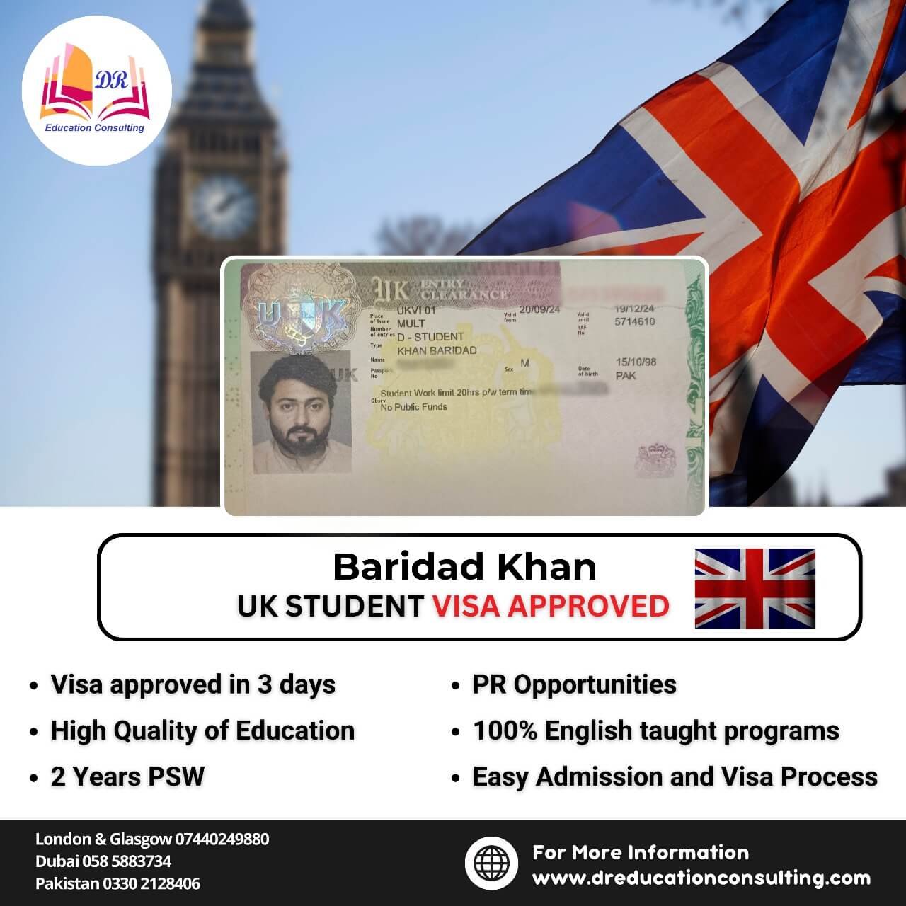 The team at DR Education Consulting is cooperative, flexible, and truly supportive throughout the process. Ms. Neha handled my case with great energy and problem-solving skills, while Ms. Naz guided me through the entire UK visa process from start to finish. The management is also very helpful, even with financial matters. I highly recommend them to anyone looking for a reliable consultancy for migration or study purposes.